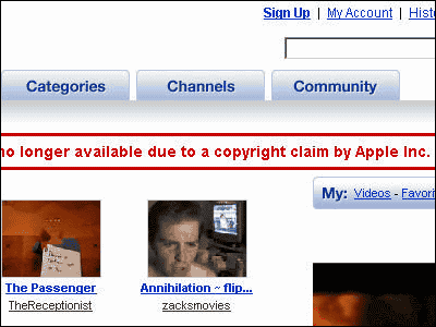 削除されたのはiPhoneそっくりのスキンを使ったPocketPCのムービー。これは個人が作ったもので、なぜAppleが削除したかは不明とのこと。同じ内容の動画がまだYouTubeに残っているので、どのような内容かチェックしたい人は消される前にどうぞ。