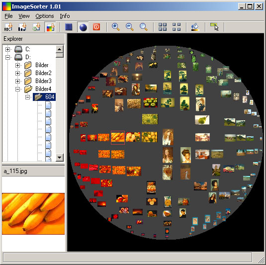 >今回紹介するフリーウェアはImageSorter、画像の主要な色情報で並び替えるソフトウェアだ。ImageSorterを起動すると、ディレクトリツリーが表示される。そこで画像が入ったディレクトリを選択しよう。すると、中に入っている画像をサムネイル表示し、更に解析してカラーでソートしてくれる。