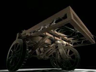 >1495年にあのレオナルド・ダ・ヴィンチもバネ仕掛けで動く自動車を設計していました。バネ仕掛けだと一定の速度で動くのは非常に難しいのですが、非常に精巧な仕掛けを組み合わせることによってバネ仕掛けでありながら一定の速度を保って走ることができるようになっています。